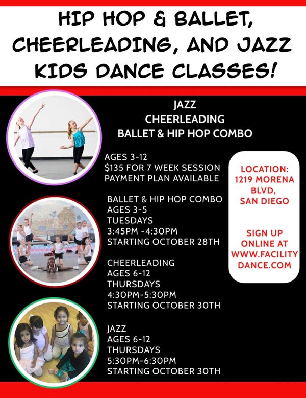 This session starts October 28th for Ballet & Hip Hop Combo and October 30th for Cheerleading and Jazz. Classes will run for 7 weeks every Tuesday from 3:45pm-4:30pm through December 16th for Ballet & Hip Hop Combo, every Thursday 4:30pm-5:30pm for Cheerleading and 5:30pm-6:30pm for Jazz through December 18th. No classes the week of Thanksgiving. These classes are open to boys and girls ages 3-5 for Ballet & Hip Hop Combo, and ages 6-12 for Cheerleading and Jazz. Location: 1219 Morena Blvd San Diego, CA 92110.