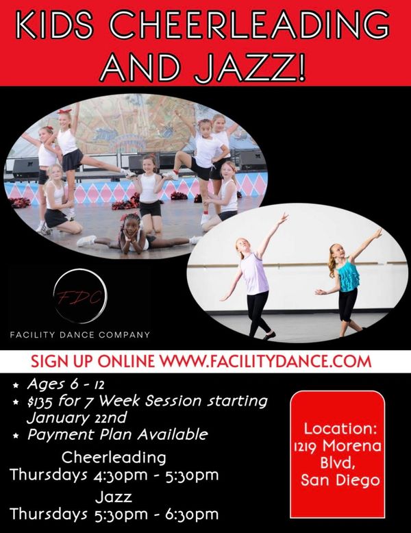 This session starts January 22nd. Classes will run for 7 weeks every Thursday from 4:30pm-5:30pm for Cheerleading and 5:30pm-6:30pm for Jazz through March 5th. These classes are open to boys and girls ages 6-12.